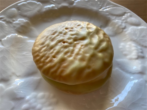チョコパイを袋から出してみると、メロンの香りがふわっとします。コーティングしているチョコは薄い黄緑色とオレンジ色を掛け合わせたような色でした。今まで色んなチョコパイを食べてきましたが、コーティングのチョコの色はチョコレート色だったので、今回のモノはとても画期的な感じがしました。