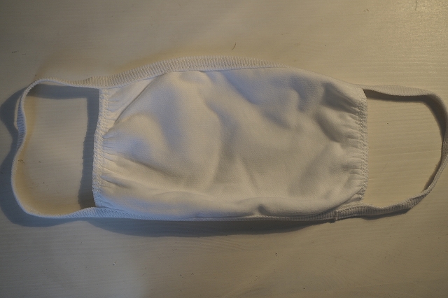 生地はTシャツのような生地で、耳掛けの部分はマスクの上下の縁から続いていて、これもTシャツの首周りのような少し伸縮性のある生地でできています。鼻からあごまですっぽり隠れる大き目で、呼吸しやすいマスクです。