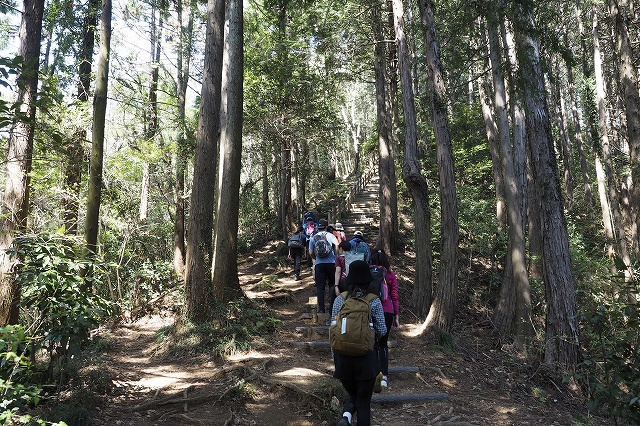 かたくりの里を出てしばらく歩くと本格的なハイキングコースに入ります。特に危険な箇所はありませんが結構登ったり下りたりが激しいコースでした。杉かひのきの木立の中を歩くことが多いですが、この時期ならではの、時々見えないほどの高い桜の木から降ってくる桜吹雪がとても綺麗でした。