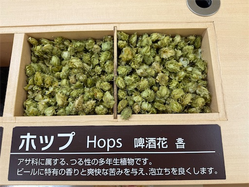 ビールの材料と作り方の説明を聞きます。基本の材料は大麦、ホップ、酵母と水です。大麦を口に含んだら香ばしくて意外に甘くておいしかったです。ホップはにおいをかぎました。
