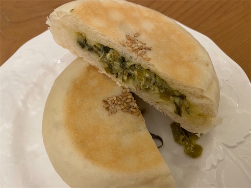 高菜のおやきはおやきのように平べったいパンの中に高菜が入っていて、他にマヨネーズやチーズも入っているのでこくがありました。