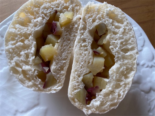 おさつホワイトは中にサツマイモのあんこが詰まっていると思って買ったのですが、実際はサツマイモの皮がついたままの小さなサイコロ状のモノが入っていて、食べごたえがあって美味しかったです。