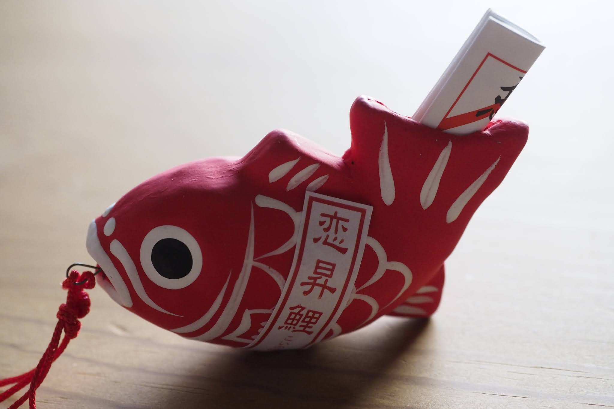 恋昇鯉(こいのぼり)です。透明な箱の中に赤白の鯉がひしめき合っているところから好きな物を選びます。1つ300円です。私は赤を選びました。そして占い結果は、末吉でした。愛の運勢は次第に良い方に向かっているとのことなので、楽しみにすることにします。