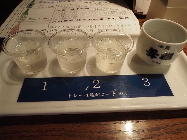 私は夏季限定の「信州舞姫 扇ラベル 純米吟醸 夏金魚」、「翠露 純米吟醸 Natural」、「信州舞姫 純米大吟醸 雄町 魅姫」を飲みました。種類は選べません。蔵の様な涼しい店内で一気に飲みました。飲むだけで何かをつまむことはできません。魅姫が一番美味しいと思いました。この試飲をすると、お猪口を1つもらえました。良いお土産になりました。