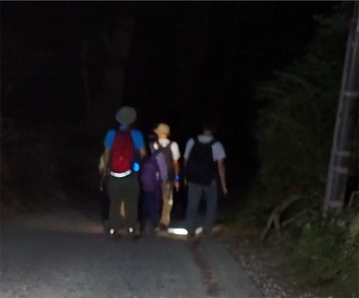 一昨年、12月にパール富士を見た後、すぐに歩いて下山したら真っ暗になり、その時はヘッドライトは持っていなかったので不気味な感じでした。今回は集団で行動し、怖い瞬間はなかったです。