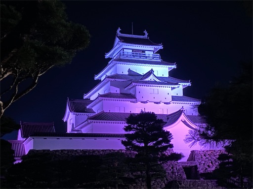 夜になって、また会津若松駅からタクシーで鶴ヶ城に向かいました。ライトアップを観るためです。お城は紫色に照らされ、妖艶な感じで綺麗でした。でも、昼間に行って、お城に上るのも良いと思います。20年以上も前に初めてお城に行った時は確か狭い階段を上った記憶がありましたが、今は美術館として整えられているようです。