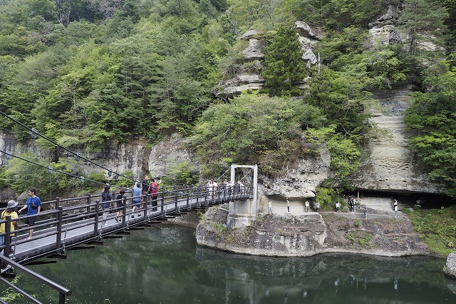 塔のへつりとは天然記念物になっている塔の形をした岩が立ち並ぶ断崖で、へつりとは方言で断崖のことです。川沿いの階段を降りていくとつり橋があり、それを渡ると断崖に沿った場所に行くことができます。岩をちょっと上がれば祠もあります。