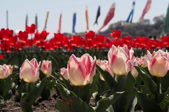 チューリップ畑には鯉のぼりが泳いでいます。展望台があり、その周りには色や形の珍しいチューリップも植わっています。是非、会場すべてを歩き回ってみて欲しいです。