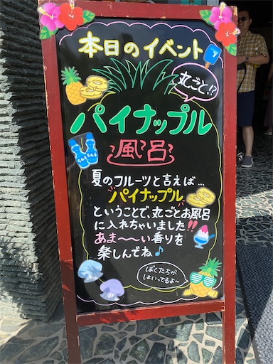 露天風呂からは富士山が見えるはずが雨がパラパラしていて雲がかかっていたので、温泉からはほとんど見えませんでした。また、いつも季節によって何か果物が湯船に浮いています。この日はパイナップルが3個浮いていました。特にお湯はにおいがしませんが、パイナップルを持つと美味しそうなにおいがしました。